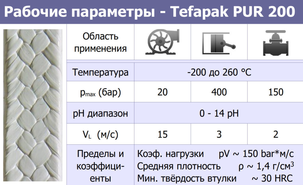Набивка PUR 200 предназначена для уплотнения насосов, плунжерных смесителей, а также статических уплотнений в химической, фармацевтической и пищевой промышленности. Набивка используется в гигиенических условиях и везде, где требуются сертификаты здоровья.
