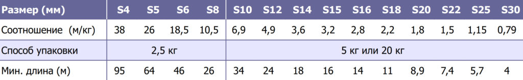Квадратные профили набивки PUR 200 от S4 до S30 поставляются непосредственно со склада. Другие размеры или другие профили с прямоугольным или трапециевидным поперечным сечением поставляются по специальному заказу клиента. В приведенной ниже таблице показано соотношение длины на килограмм набивки и минимальная длина намотки набивки на отдельной упаковке.